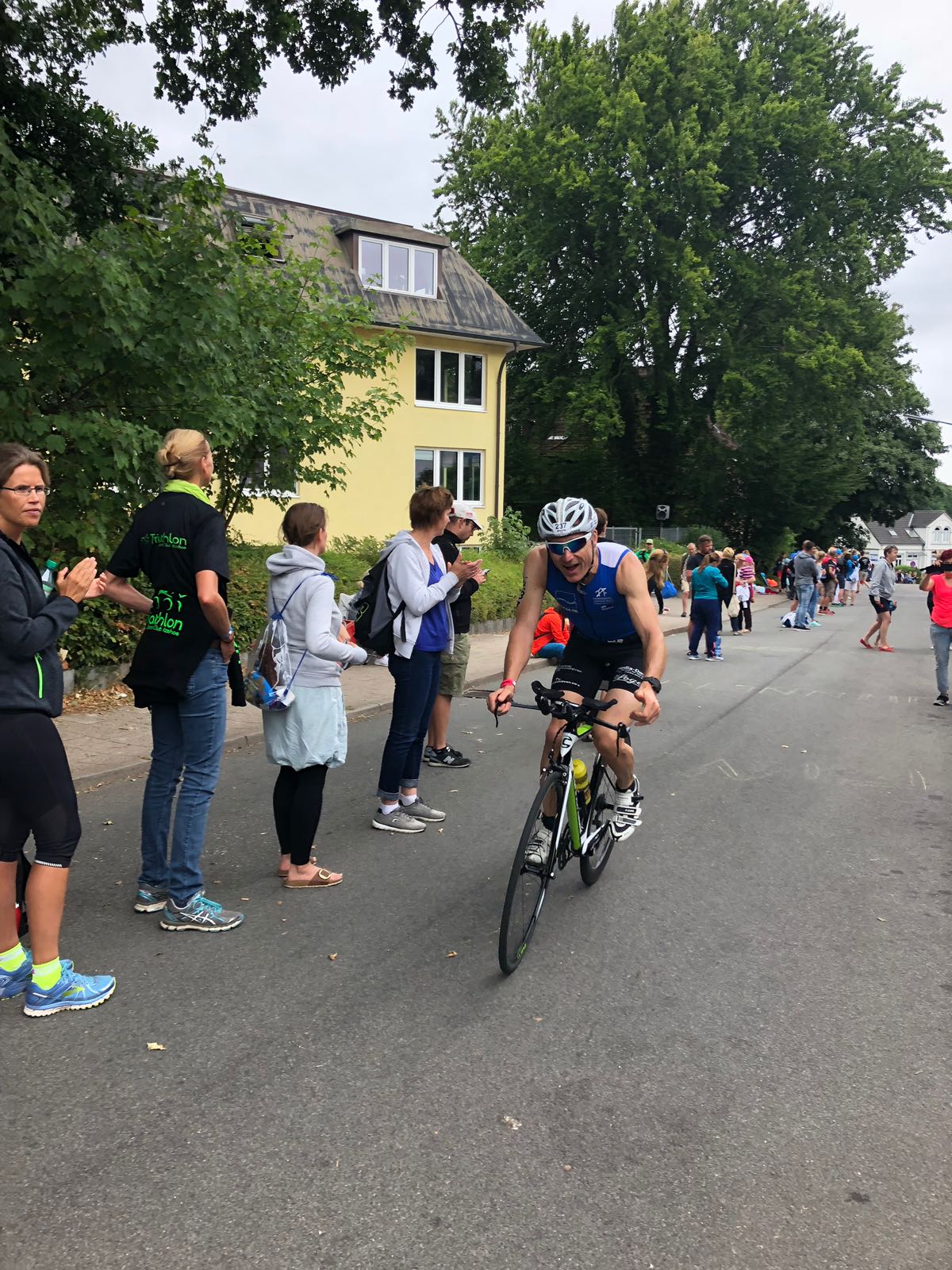 Pünktlich zum Radstart zog sich der Himmel dann leider zu und – man mag es angesichts der hohen Temperaturen im Münsterland kaum glauben – die Athleten begannen tatsächlich etwas zu frieren. Der aufbrausende Wind tat sein Übriges dazu. „Wenn da nicht noch dieser 6-Mal zu fahrende Rundkurs mit jeweils 220 hm zu bewältigen wäre“ – so ging es dem einen oder anderen auf der Radstrecke mit Sicherheit mehr als einmal durch den Kopf. Diese Gedanken schwanden aber schnell bei der Auffahrt des „Sandwig-Hills“– einem Stimmungsnest ähnlich dem Solarer Berg in Roth. Spätestens als es dann auch noch zu regnen begann, war auch dem Letzten klar, dass diese Langdistanz wirklich kein Zuckerschlecken ist. An dieser Stelle gilt Martin Koppe der größte Respekt, der in Glücksburg erfolgreich seine erste Langdistanz bestritt.