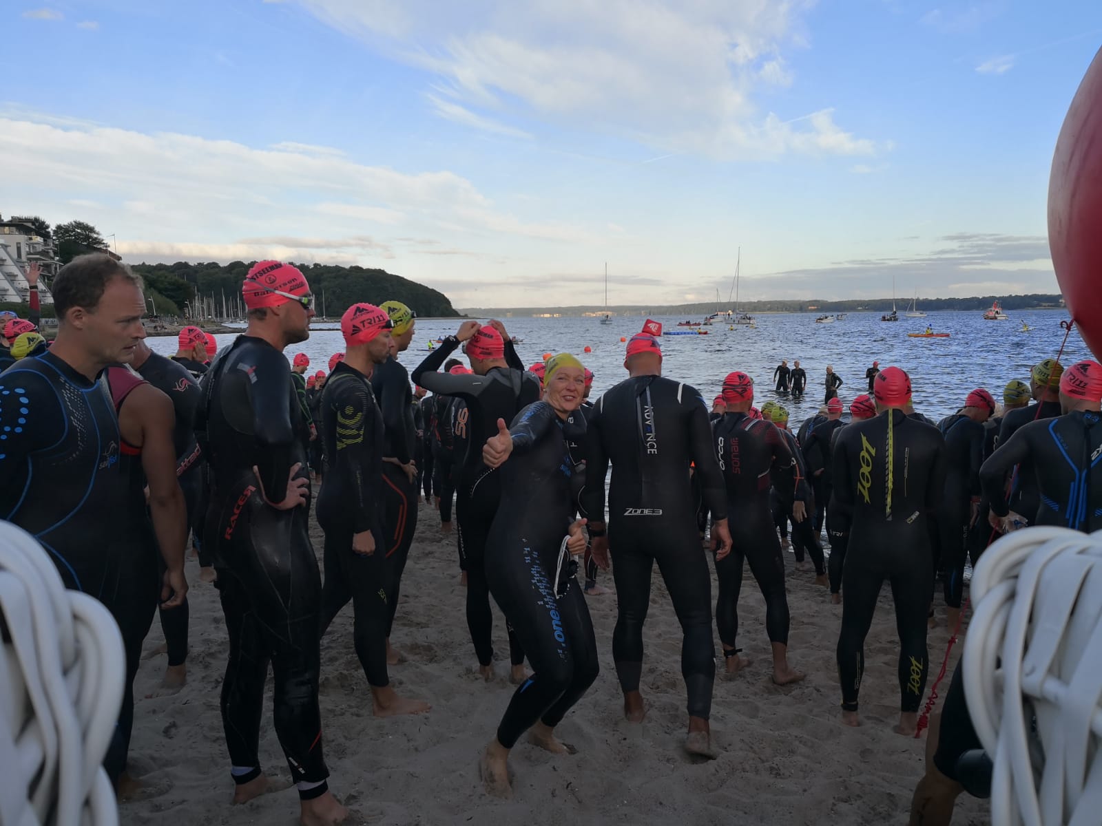 Als Sonntagmorgen um 6:50 Uhr die Nationalhymnen der Starterinnen und Starter ertönten, die Sonne am Horizont aufstieg und der Pfarrer aus Glücksburg einige aufmunternde Worte sprach, konnte sich wohl niemand dem Gänsehaut-Feeling entziehen. Doch dann ertönte schon das Startsignal und die Athleten, Staffel- und Einzelstarter, begaben sich in die Ostsee. Schnell merkten sie, dass da noch andere „Wesen“ schwammen – Quallen. Aber auch an diese Wegbegleiter gewöhnten sich die W+F’ler und so waren sie von da an nur noch damit beschäftigt, die passende Welle zu erwischen, um möglichst energiesparend die erste Disziplin hinter sich zu bringen.