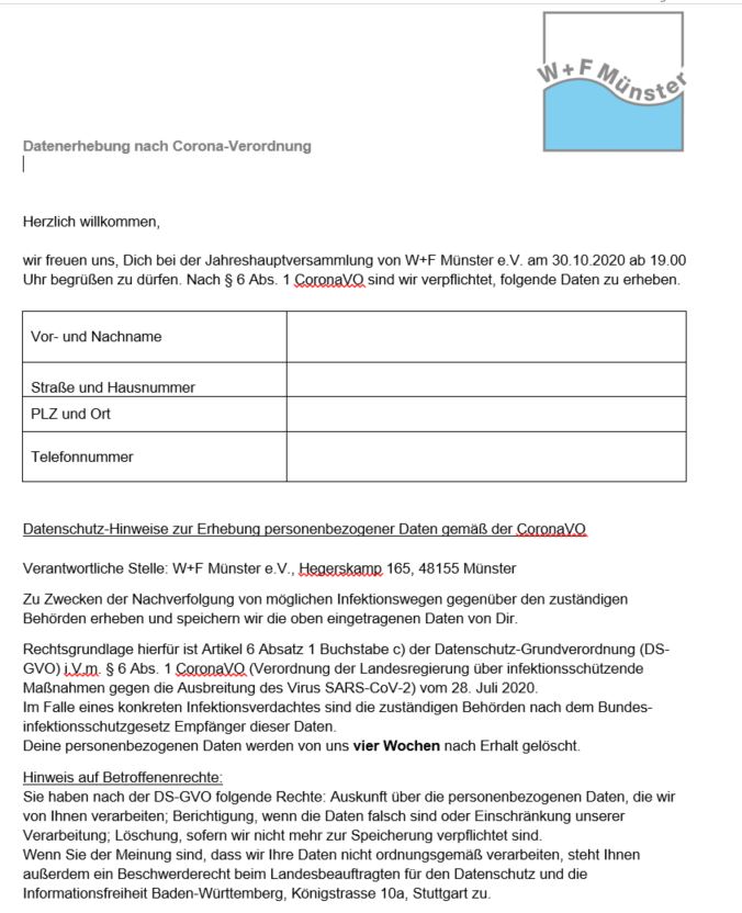 Die Jahreshauptversammlung findet statt am Freitag, dem 30. Oktober 2020 um 19.00 Uhr im Fest- und Veranstaltungssaal des Bennohauses, Bennostraße 7, 48155 Münster; auf Grund der Corona-Bestimmungen mussten wir auf einen größeren Saal ausweichen, der jedoch an unserem traditionellen Termin nicht zur Verfügung stand. Wichtig: bitte unbedingt Eure Kontaktdaten für die Covid-19 Nachverfolgung vorab an Diese E-Mail-Adresse ist vor Spambots geschützt! Zur Anzeige muss JavaScript eingeschaltet sein! schicken (s. Formular). Eine Teilnahme ohne vorherige Anmeldung ist wegen einer aufgrund der Raumgröße zwingend notwendigen Sitzordnung nicht möglich.