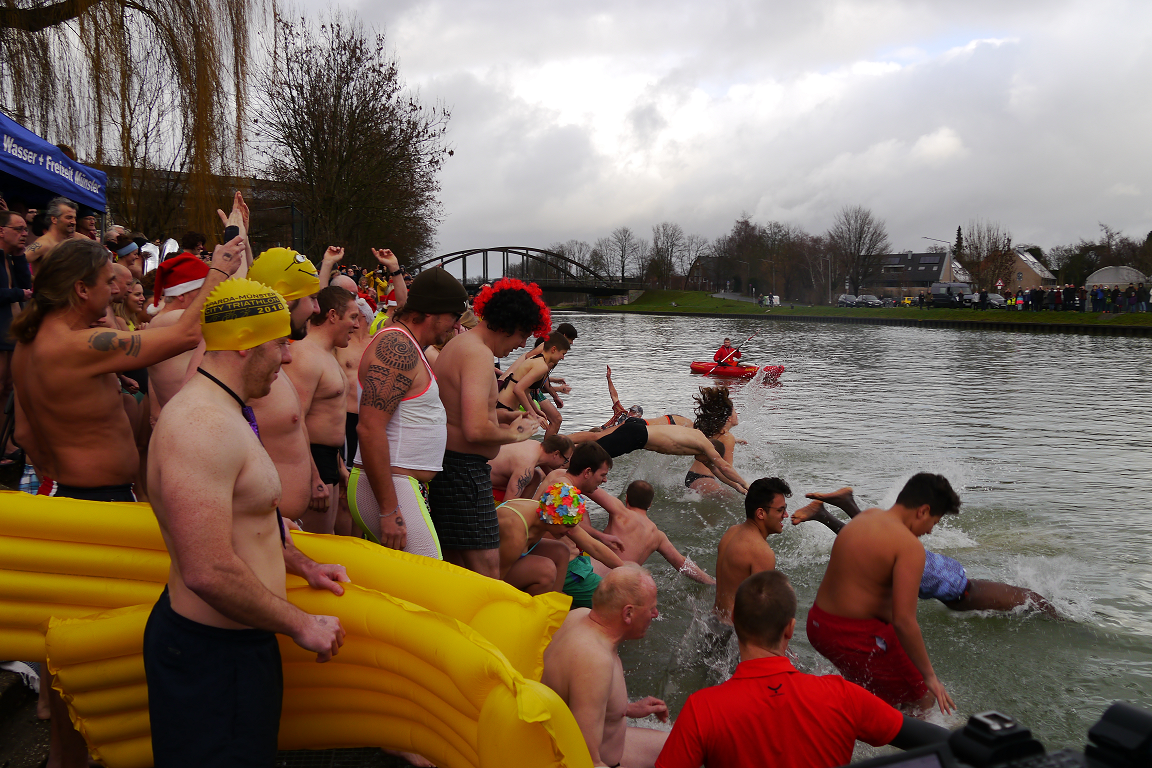 Trotz des Nieselregens am Neujahrsmorgen standen um Punkt 13:00 Uhr 200 Wagemutige am Rand des Kanals, bereit sich in die 8°C kalten Fluten zu stürzen. Ein neuer sensationeller Rekord! Etwa 300 Schaulustige unterstützten die Schwimmer an beiden Seiten des Kanals mit Klatschen und lauten Jubelrufen. Pappplakate mit motivierenden