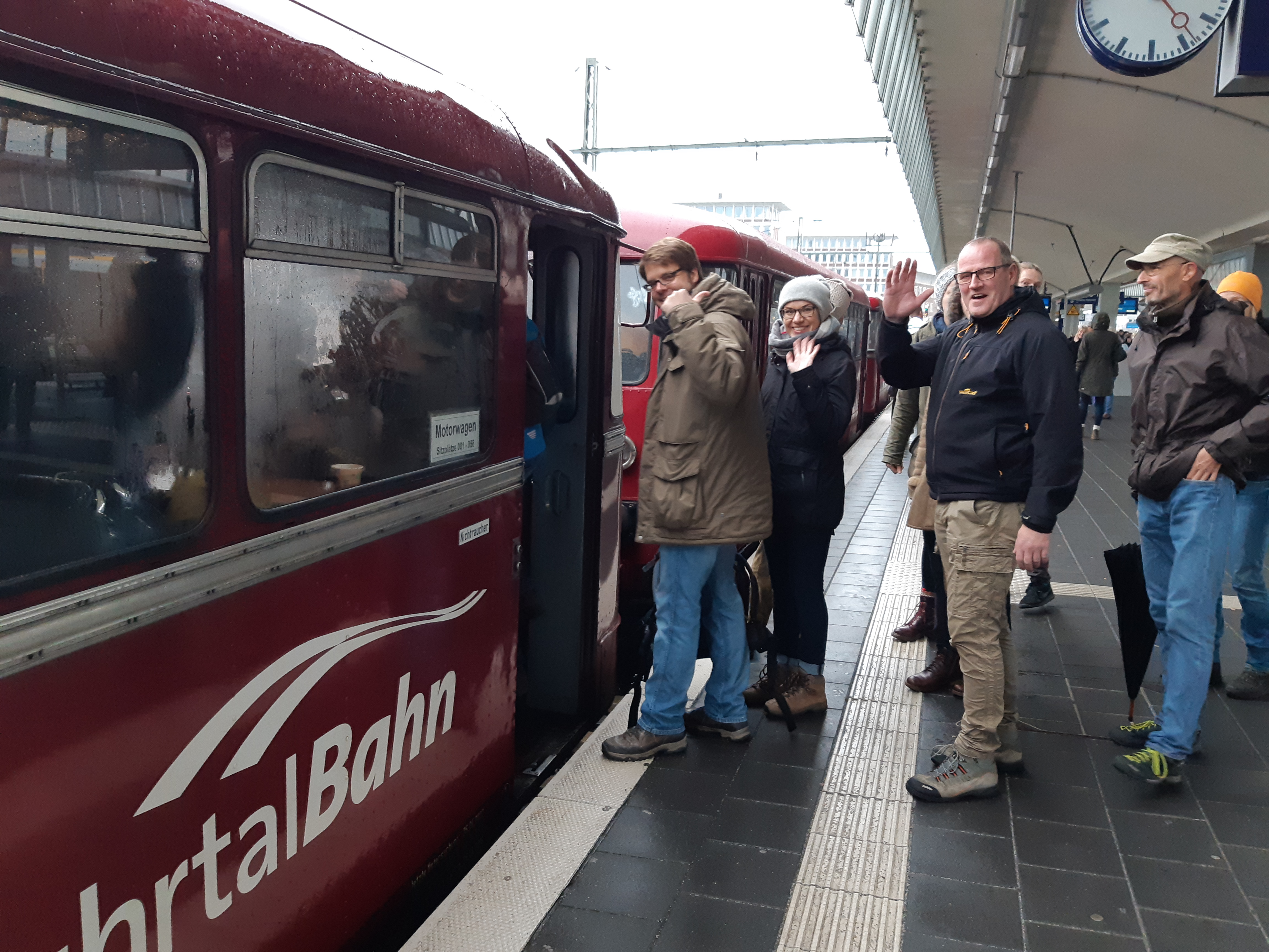 Am ersten Advent ging es mit dem nostalgischen Schienenbus der Ruhrtalbahn nach Billerbeck. Ca. 35 W+F´ler trafen sich pünktlich um 11.15 Uhr im Münsteraner Hbf. Leider verspätete sich der Pängelanton um mehr als 2 Stunden und so ging dann nur eine deutlich dezimierte Gruppe auf die Reise nach Billerbeck. Die Fahrt vermittelte ein völlig neues Fahrgefühl. Wir konnten dem Zugführer über die Schulter schauen und hatten so schon unterwegs die Baumberge fest im Blick. Ein Teil der Mitfahrer entschied sich für den Weihnachtsmarktbesuch in Billerbeck und 11 unerschrockene Wanderer machten sich bei noch anfänglichem Nieselregen auf den Weg nach Havixbeck. Unterwegs erwartete uns die von Dirk und Barbara bestückte mobile Glühweinstation. Deutlich aufgewärmt und neu motiviert nahmen wir das zweite Teilstück unter die Wanderschuhe. Mit guter Stimmung und hoch zufrieden mit den gewanderten rund 10 Kilometern stiegen wir in Havixbeck wieder in den Schienenbus und rollten gemütlich zurück.