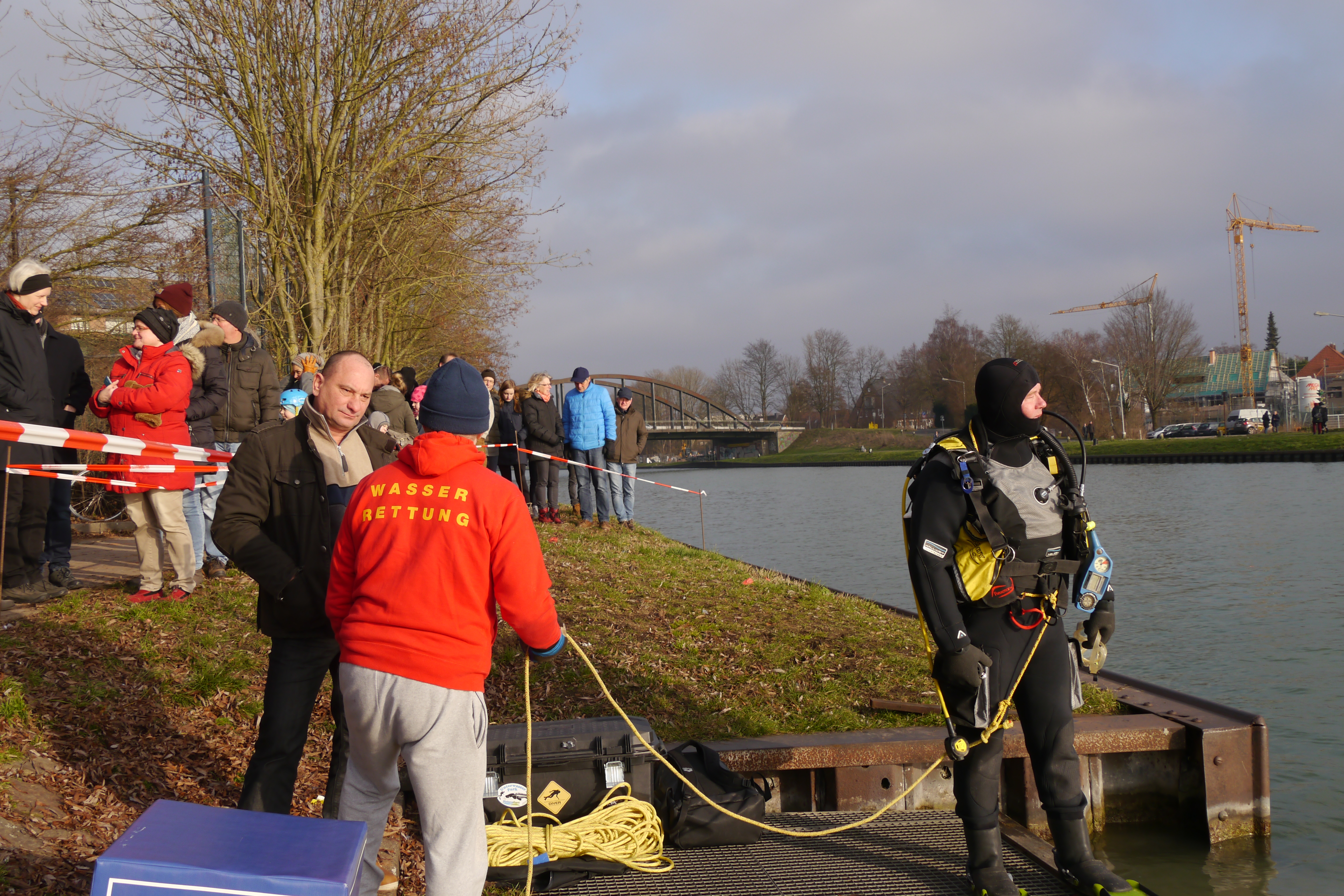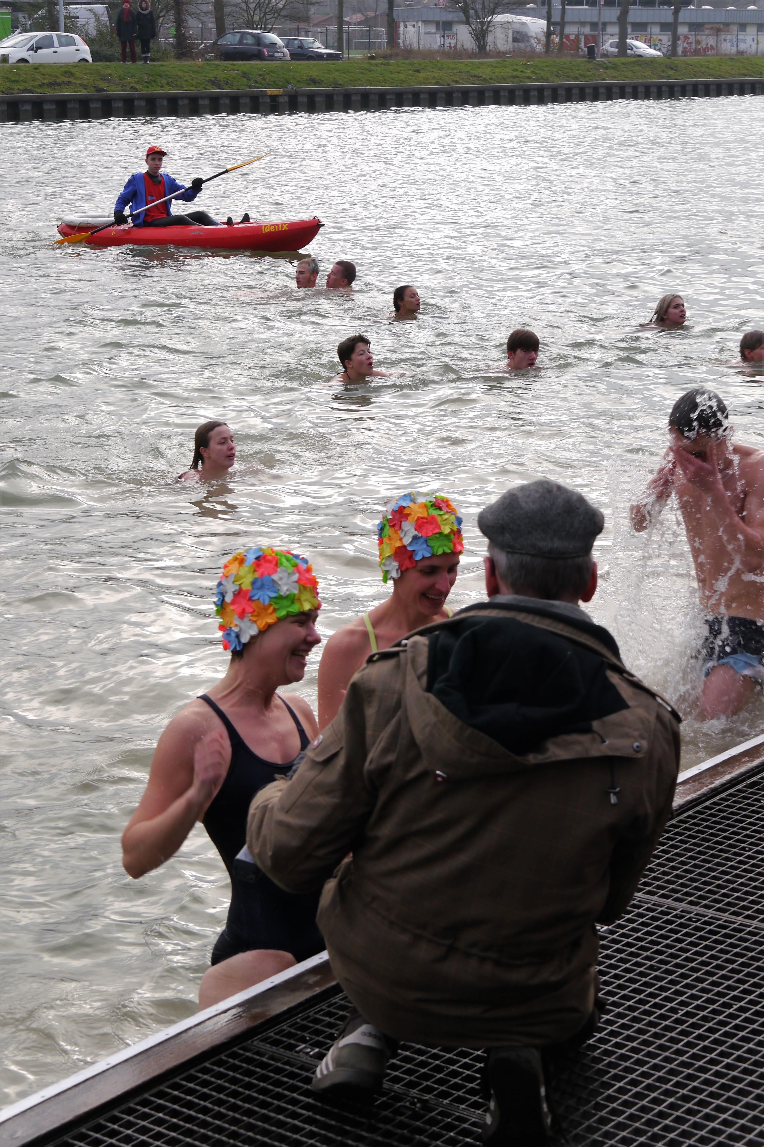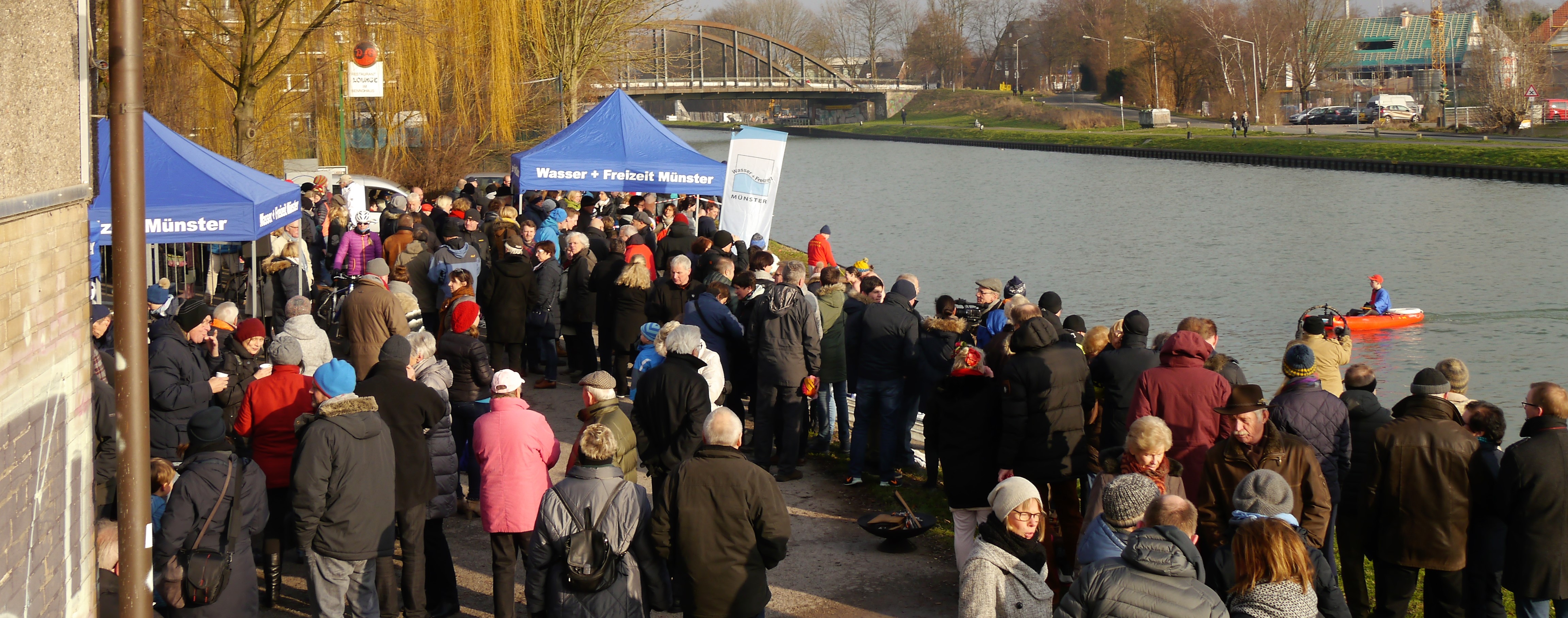 Pünktlich um 13 Uhr startete das sechste Neujahrsschwimmen von Wasser und Freizeit im Dortmund-Ems-Kanal. Ganze 4 °C zeigte die Thermometer-Badeente an, als sie in den Kanal gehalten wurde. 28°C wäre ein Kaltbad gewesen; in Münster gab es also lediglich ein Eisbad, wie es der Vorsitzende treffend auf den Punkt brachte.